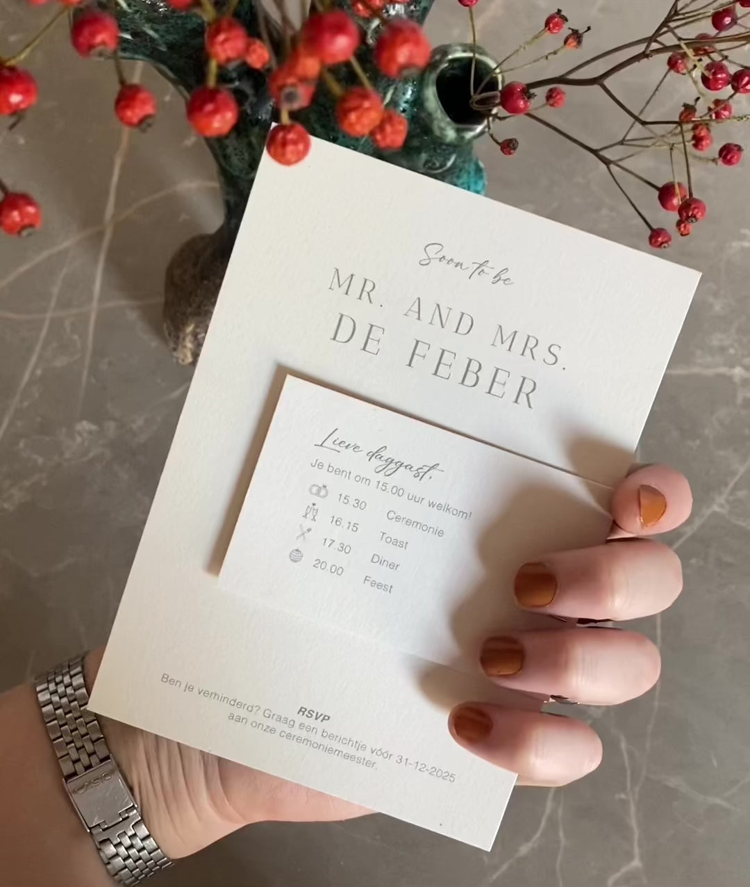 Voor mijn broer en schoonzus ontwierp ik dit trouwkaart design, een persoonlijke en bijzondere opdracht binnen mijn portfolio.